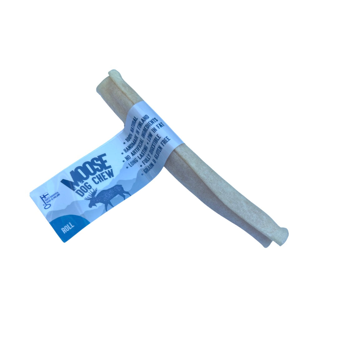 RAUH!® Moose Chew Roll, made from 100% genuine Nordic moose hide using traditional methods at Europe’s only factory that specialises in moose dog chews in Loimaa, Finland.